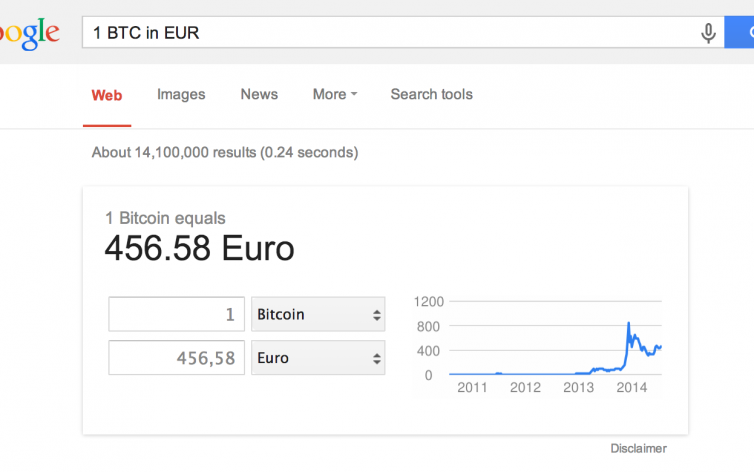Месяцем ранее корпорация Google уже обратила свое внимание ра растущую популярность криптовалюты и добавила ее текущий курс, как и исторические данные на свой сервис Google Finance. Сейчас стало еще проще: достаточно набрать в поисковой строке “price of bitcoin” или “X btc in eur” или “X bitcoin to usd” или, наоборот, “X usd in bitcoin” (где X — это какое-то число), то этот запрос будет распознан и поиск выдаст текущий курс с сервиса Coinbase.